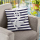 Um travesseiro náutico moderno e bonito para o marinheiro no coração. Este travesseiro apresenta um fundo marinho e listrado branco com uma âncora prateada à vela. Este travesseiro é excelente para a sua sala temática náutica, cabana ou veleiro.