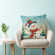 Um boneco de desenho animado com um cachecol e chapéu em meio a árvores de neve sob um céu sereno e crepúsculo.