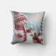 Um boneco de neve vestindo um chapéu vermelho e cachecol segura um cone de sorvete para um pequeno cachorro vestido de inverno correspondente