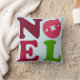 This midcentury modern pillow features the French Christmas word NOEL in fun retro typography, against a cool blue background. A cute 1960s ornament stands in for the "O." The letters are in a chic retro color palette with greens, gold, and red.