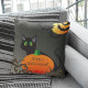 Um travesseiro de halloween com uma cena assustadora e fofa de um gato preto parado atrás de uma abóbora debaixo de uma lua de cheio. Os morcegos estão voando sobre a cabeça dos gatos.