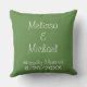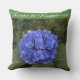 Bonito Hydrangea Azul com folhas verdes grandes Travesseiro de Casamento. A FRENTE do Travesseiro tem a redação, Amor e Felicidade com uma fotografia aproximada de bonito hidrangea azul. A parte de trás do Travesseiro é mostrada em uma cor de fundo verde-claro com a área a ser personalizada com os nomes e a data de casamento da nova noiva e do noivo. Design de fotografia original por TamiraZDesign.