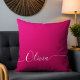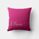 Almofadas personalizadas com nome em grafia de caligrafia elegante branca com brilho rosa apresentam um design moderno e tendência simples e elegante com o seu nome personalizado em tipografia de caligrafia manuscrita elegante sobre um fundo metálico com brilho rosa. Criado por ©Evco Studio www.zazzle.com/store/evcostudio