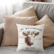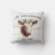 Farmhouse Highland Cow Family Name Travesseiro decorativo - travesseiro apresenta uma vaca Highland com uma coroa floral sobre um fundo de madeira rústica. Adicione um toque de campo a qualquer sala. Mostrado com fundo branco de madeira. Também disponível em madeira escura.