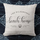 Caligrafia moderna, com script chic, lendo BEACH HOUSE ao lado do seu nome familiar em uma design motriz de tipografia. Excelente de travesseiro personalizado para decoração doméstica para sua casa longe de casa. Nosso travesseiro de escudo de madeira branca, estilo fazenda, apresenta uma ilustração doce de uma concha entre sua localização e o ano estabelecido.
