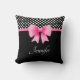 Travesseiro decorativo de impressão de nome personalizado com uma faixa cor-de-rosa em um padrão de bolinhas preto e branco. Para personalizar, digite seu nome no campo modelo. Correspondência de decoração pessoal disponível na Loja de padrões de pontos e riscas.