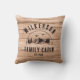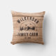 Travesseiro decorativo moderno e russo com uma montanha da floresta moderna design com cordilheira, pinheiros, madeiras e pássaros cercados pelo seu nome familiar personalizado em fundo impresso de madeira, um nome personalizável da sua cabana, cabana, casa de lago ou qualquer outro local de reunião familiar, bem como do ano estabelecido.