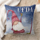 Entre no espírito de feriado com este travesseiro de gnomo de aquarela bonitinho apresentando um gnomo nórdico vermelho e branco tentando equilibrar em seus esquis. Há um texto branco que diz Ufda." As costas têm um padrão de isle vermelho e branco.