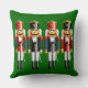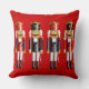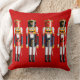 Este travesseiro decorativo festivo decorado com os soldados de brinquedo de noz do nutcracker em uniformes coloridos, com chapéus engraçados, barbas brancas spiky, e os bigodes pretos longos, prá um sorriso sobre qualquer um cara!