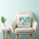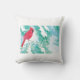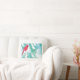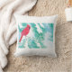 Este travesseiro dec foi projetado tendo em mente os feriados. Decorado com um cardeal vermelho sentado em um galho coberto de neve de um pinheiro olhando pelos flocos de neve descendo do céu. O chão está coberto de branco.