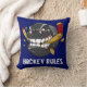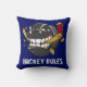 Travesseiros engraçados customizáveis do disco de hóquei com os travesseiros irritados legal do disco de hóquei. As regras do hóquei ou datilografam dentro SUA NOME ou texto ou supressão. A parte traseira é o lado sério com varas de hóquei, disco de hóquei e máscara do hóquei. As INSTRUÇÕES abaixo em como mudar o azul imprimiram o texto da cor e do branco do fundo a suas cores da equipa de hóquei ou a sua decoração do quarto do hóquei. Refrigere o disco de hóquei irritado que chomping em varas de hóquei. Chame Linda para MUDANÇAS de design e AJUDE-A: 239-949-9090