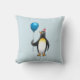 O pinguim pronto para a festa está segurando um balão azul com sua luva direita e um chapéu de festa em sua cabeça.