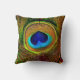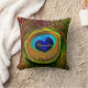 Um travesseiro do deco com uma fotografia impressionante do close up de um coração vibrante e bonito deu forma aos olhos azuis de uma pena de pássaro lindo do pavão de turquesa e de ouro. Personalize adicionando seu nome. Aperfeiçoe a maneira para que os amantes do pássaro digam: Eu amo pavões!