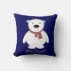 O travesseiro bonito para a sala de criança pequena, urso polar com o lenço vermelho no fundo dos azuis marinhos, personaliza com nome da criança; Para trás do travesseiro é marinho combinar bonito & bolinhas brancas