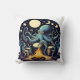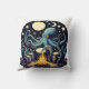 Um polvo joga bateria alegremente enquanto duas figuras desfrutam de uma fogueira sob um céu noturno estrelado iluminado pela lua.