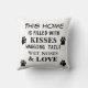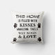 O travesseiro decorativo bonito para amantes do cão com pata preta imprime com corações vermelhos. Dizendo no travesseiro… esta casa é enchida com os beijos, os narizes molhados, as caudas sacudindo e o amor. Excelente para você ou para seus amigos do amante do cão.