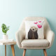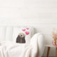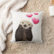 Um travesseiro com uma imagem de uma fofa com corações flutuando para cima. Os corações são cor-de-rosa e gordinhos com uma reflexão brilhante. Esta lontra é muito adorável com as patas descansando sob seu queixo peludo. Seu pelo parece molhado de pendurar na água.