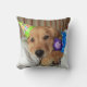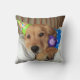 Já esteve cansado depois de um longo dia celebrando seu aniversário? Este travesseiro mostra uma fotografia de um cachorro que recupera um ouro giro preso na cama, enquanto veste pijama e um chapéu de festa e segura seu ursinho de pelúcia. Hora de dormir!