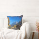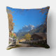 Travesseiro decorativo da foto com uma paisagem rural com uma estrada, um celeiro e as árvores em cores da queda e em uma vista para montanhas das dolomites de Geisler ou de Odle no outono no vale de Funes dos di de Val em Tirol sul, Italia.
