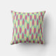 Este travesseiro decorativo tem um design geométrico feito de fundo de retângulos verde-marinho e azul-claro com ovais amarelos e cor-de-rosa no topo.