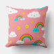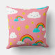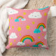 Padrão sem costura colorido mostrando nuvens sorridentes, arco-íris vibrantes, estrelas amarelas e nuvens azuis em um fundo cor-de-rosa. Este design alegre é ideal para produtos infantis, wallpapers e projetos criativos.