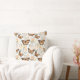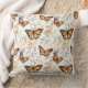 Há um bando de borboletas laranja Monarca voando em ambos os lados deste travesseiro decorativo bonito. Junto com as imagens da borboleta estão cinzas e designs cor de laranja floral e folha.