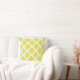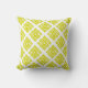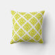 Uma chave tribal geométrica e um travesseiro de estilo angular cortado padronizado em verde limão brilhante e branco. Desenhada por Sarah Trett. Pareceria excelente em um quarto, sala ou jardim.