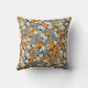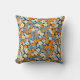 Um padrão floral vibrante cobrir toda a imagem. Flores pequenas e estilizadas em tons de laranja, azul claro e esbranquiçado são dispostas densamente sobre um fundo azul marinho. As flores têm um aspecto ligeiramente imperfeito, pareceria, com variações na saturação e forma das cores que dão ao padrão um aspecto texturizado, quase pintado à mão. O padrão repetido cria um efeito visual alegre e ocupado.