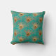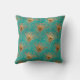 O travesseiro decorativo bonito apresenta um padrão de penas de pavão com brilho dourado em fundo aqua.