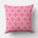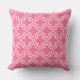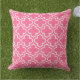 O travesseiro na moda apresenta um moderno padrão decorativo marroquino de quatrefoil em branco. Personalize o fundo cor-de-rosa brilhante para coordenar com a decoração ao ar livre.