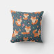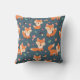 Um travesseiro com um padrão feito com raposas de laranja bonitinhas e felizes. Fundo verde escuro. Pequenos cogumelos e folhas espalhados.