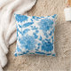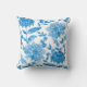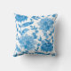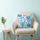 Almofada quadrada com fundo branco apresentando um vibrante padrão floral azul. Tanto a frente quanto a parte de trás apresentam o mesmo design intrincado.