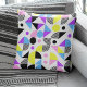 Este travesseiro moderno apresenta um padrão geométrico colorido, sem costura, com linhas e formas em amarelo, azul, rosa, roxo e preto sobre fundo branco.