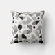 Este travesseiro moderno apresenta um padrão geométrico monocromático sem costura com várias linhas e formas em tons pretos e cinzas sobre fundo branco.