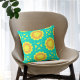 Design de travesseiro decorativo de vibração com um padrão sem costura feito de formas geométricas em laranja e amarelo sobre fundo turquesa.