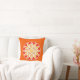 Travesseiro decorativo em um padrão mandala de doze pontos em tons de ouro mostarda, ferrugem, creme e vermelho coral profundo, sobre um fundo laranja mandarino