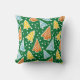 As árvores de Natal estilizadas, coloridas, modernas e esmeriladas apresentam um travesseiro decorativo de árvores de Natal coloridas, em turquesa, laranja, amarela e flocos de neve em fundo verde.