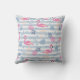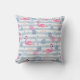 Travesseiro com um padrão com uma vibração de verão divertida. flamingos e abacaxis cor-de-rosa, colocados sobre um padrão listrado azul claro com folhas e corações ao redor.