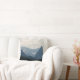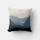 Um travesseiro com uma fotografia de belas montanhas, céu nublado e colinas rolantes cheias de árvores em primeiro plano. esquema de cor azul da cinza.