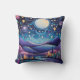 Um travesseiro com uma bela ilustração. Vírus caprichoso e fantasioso. Uma lua grande brilhando com estrelas ao redor. Passando por uma bela paisagem de árvores, montanhas e um rio sinuoso. Incrível vibração mística mágica.