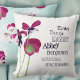 Pansias cor-de-rosa e trabalho de arte de turquesa, travesseiro de Dia de as mães personalizado é atraente com paletas de cor violeta, roxa e turquesa. Liste os nomes dos filhos ou netos e mude facilmente as fontes, a cor e o posicionamento. Presente perfeito para mãe ou avó. O design com rolha tem belas turquesas e trabalho de arte de flores cor-de-rosa atrás.