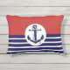 Esta design náutica é perfeita para uso interno ou externo. A frente deste travesseiro de destaque apresenta faixas claras, azuis e brancas, marinhos e nítidas, na parte inferior e vermelho sólido, na parte superior. O centro da design tem um círculo branco, com uma âncora azul marinho. Na parte de trás do travesseiro, o design é um padrão repetitivo da âncora sobre um fundo vermelho.