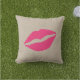Os lábios corajosos, brilhantes, cor-de-rosa em um fundo de linho ilustrado de serapilheira acentuam este travesseiro exterior bonito, fazendo lhe um acento doce no patamar, na plataforma, pátio ou pela piscina.