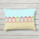 Venha com toda a nostalgia sobre sua viagem ao litoral com este travesseiro colorido ao ar livre com a imagem tradicional de praia huts alinhados na praia.
