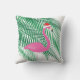 Este coxim exterior tropical do feriado é decorado com um divertimento, flamingo cor-de-rosa que veste um chapéu vermelho do papai noel contra um contexto das folhas de palmeira em um fundo branco, fazendo lhe o acessório perfeito do Natal para o lugar tropical.