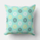 Travesseiro decorativo com um padrão único de flores que são feitas de círculos de cavalos marinhos. Flores marinhas em branco, amarelo claro e verde-aqua escuro em um fundo aqua claro.