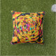 Esse travesseiro lança um desenho abstrato que se parece com um redemoinho de faixas de tigre em tons nojentos de laranja, amarelo e vermelho com pequenos toques de rosa-quente, verde limão e aqua, todos disparados por listras pretas.