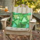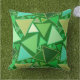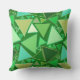 Mosaico geométrico moderno do século médio de triângulos esboçados em tons de esmeralda e jade verde, aqua e bege, num travesseiro verde esmeralda ao ar livre