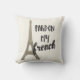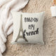 Travesseiro decorativo anca com "perdão meu francês," escrito com caligrafia e as pias batismais escritas à mão sobre uma imagem da torre Eiffel.