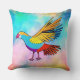 Um pássaro de cor vívida com formas geométricas estilizadas espalha suas asas. As suas penas são dispostas segundo um padrão dinâmico que apresenta tons negros de laranja, azul, amarelo e vermelho.